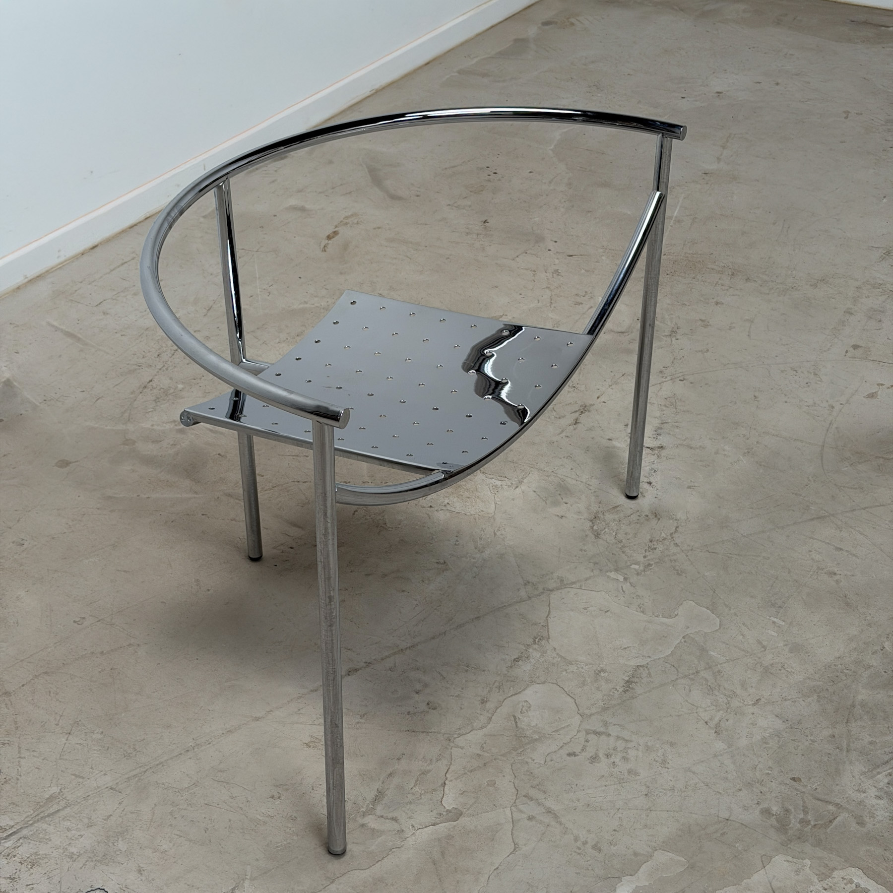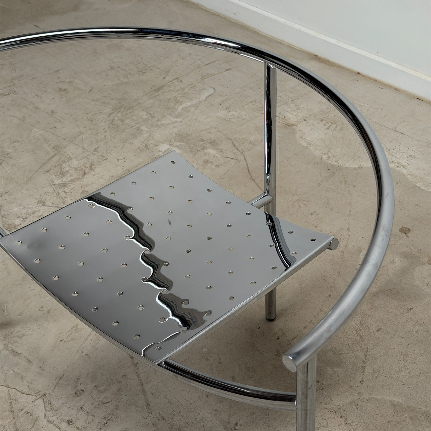 Its chromed tubular structure creates a light architectural silhouette, defined by clean curves and balanced proportions. The construction expresses the experimental spirit of Starck’s early furniture, where function and visual tension are closely linked.