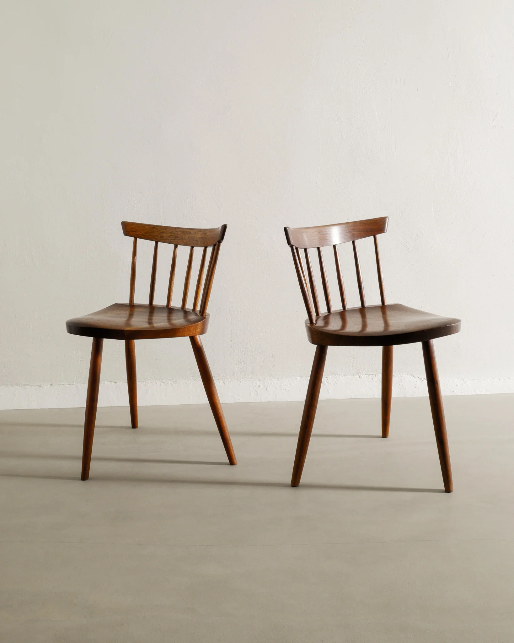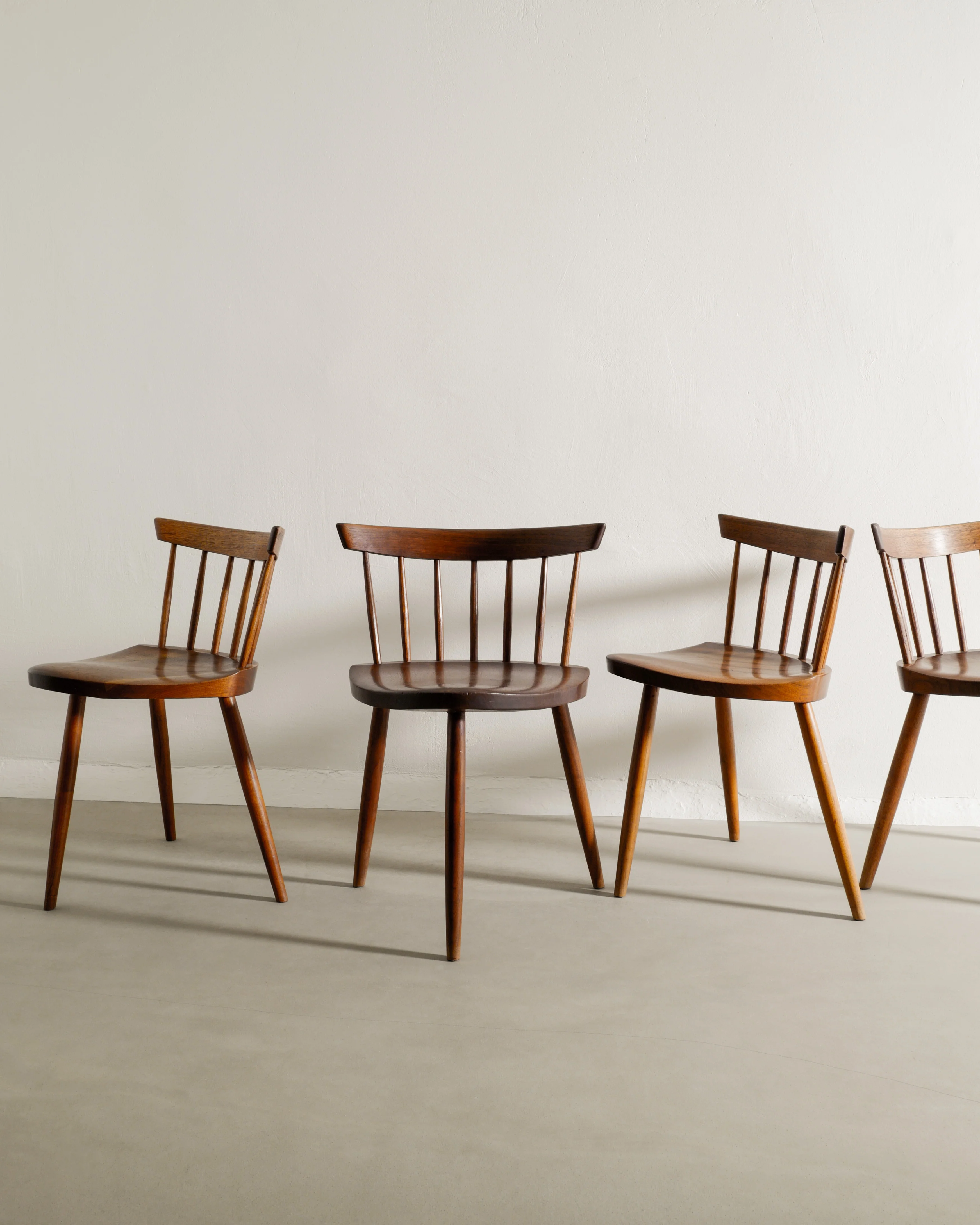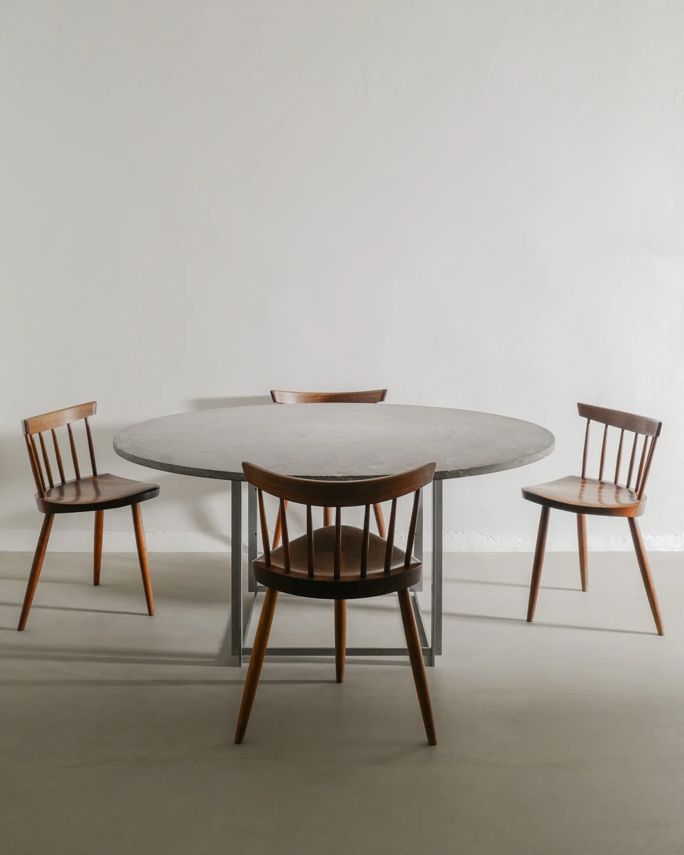 Rare mid century dining set consisting of a circular "PK54" table with cippollini marble by Poul Kjærholm for E. Kold Christensen Denmark and a set of four Mira Nakashima dining chairs in dark American walnut produced in in their own studio 1963.