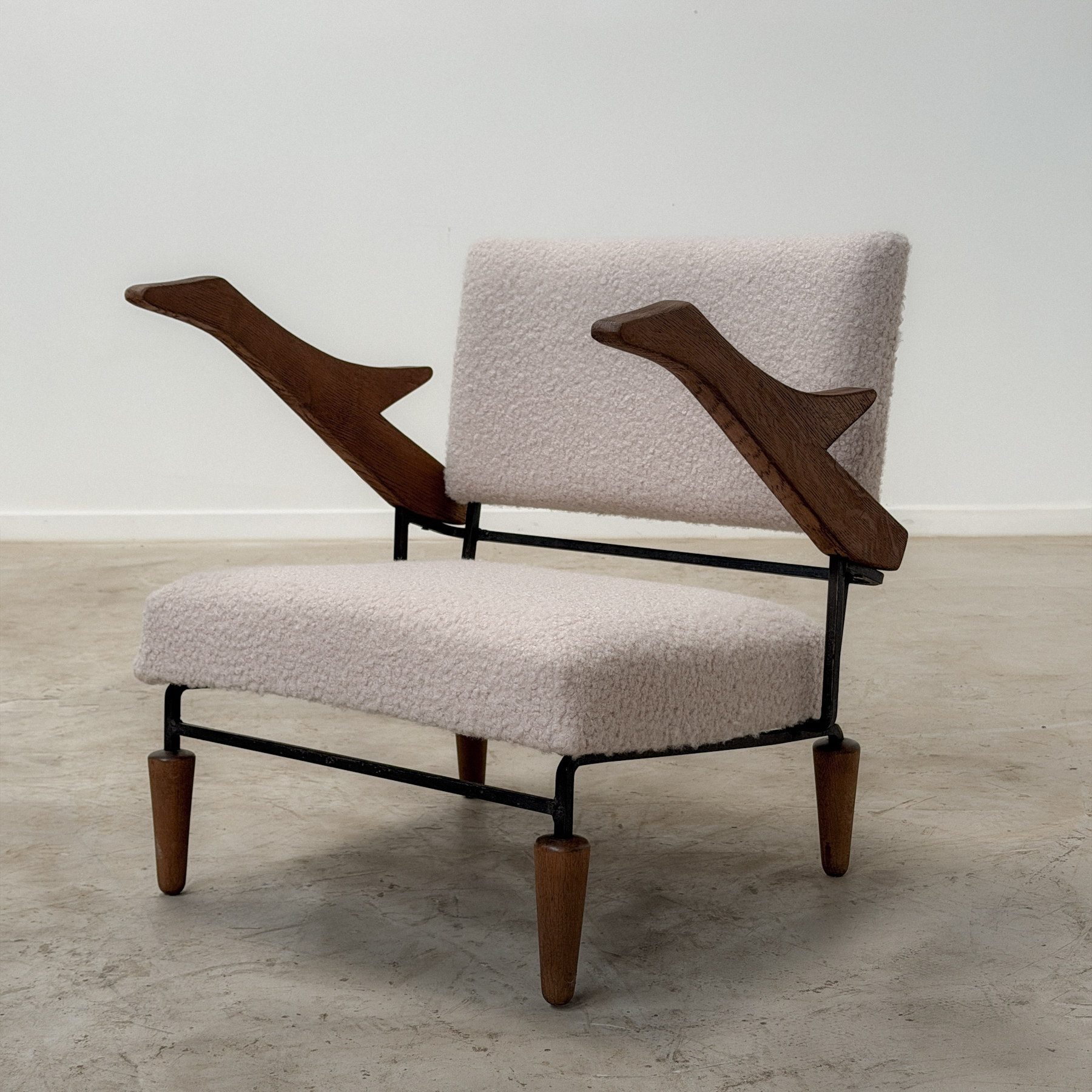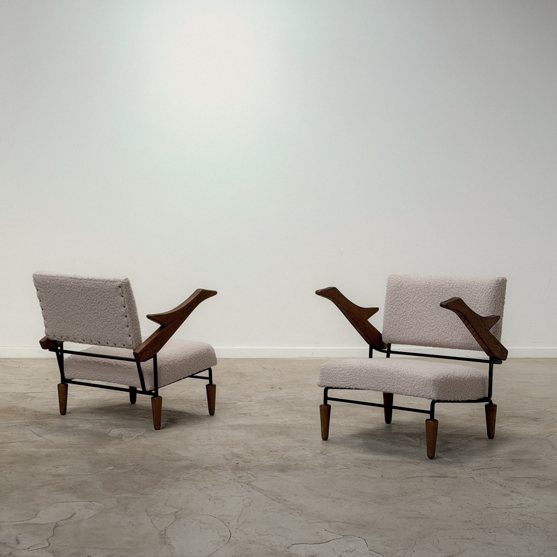 A sculptural and uncommon duo from the 1960s with a distinctly architectural silhouette.Solid wood and black metal structure, openwork armrests with organic lines, tapered legs — pure modernis